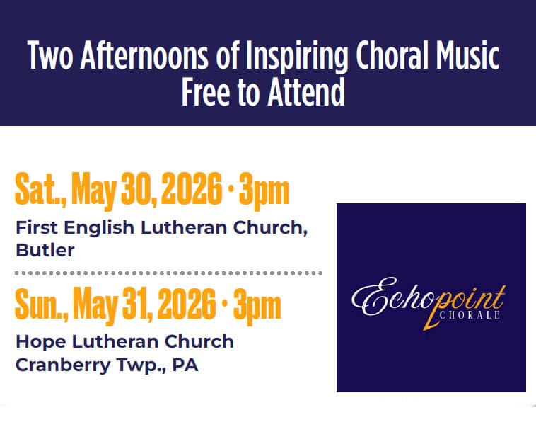 EchoPoint Chorale is a non-profit chorus composed of regional volunteer vocalists dedicated to enriching the cultural life of Western Pennsylvania through high-quality choral performance.
